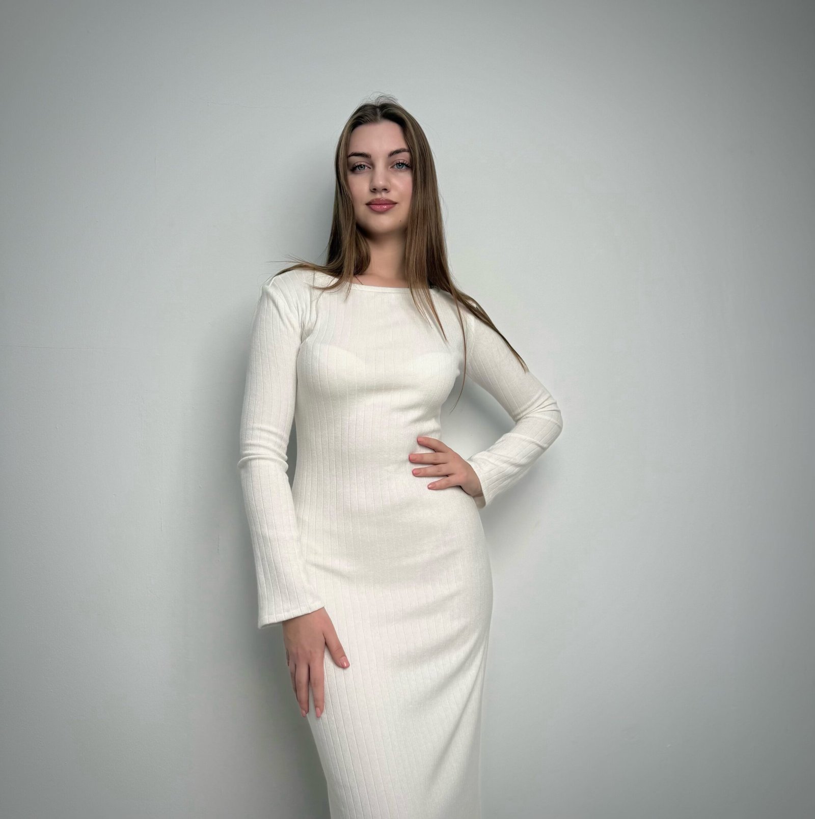 Rochie lungă, maxi , cu siluetă ajustată pentru evidențierea taliei. Țesatura este tricotaj tip rib, cu mâineci lungi evazate.